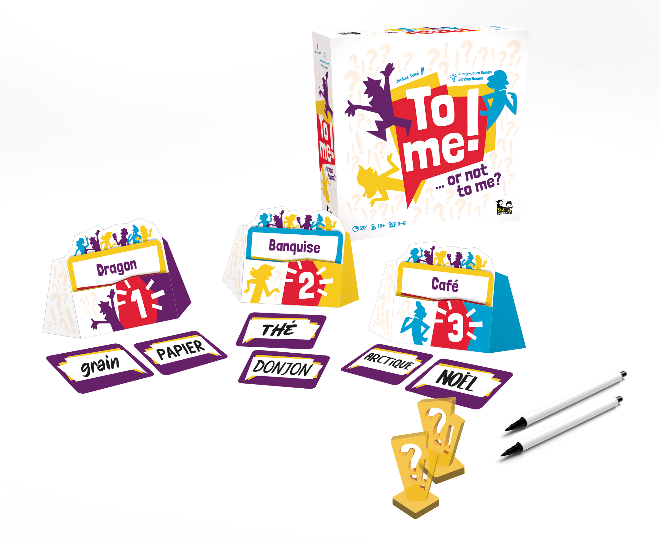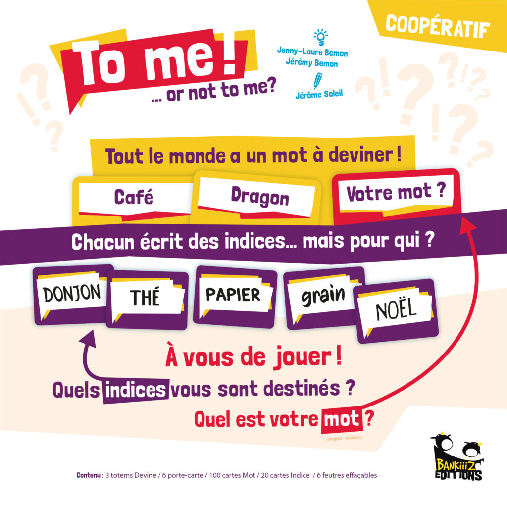 Dans To me! …or not to me?, coopérez pour faire deviner les mots de chaque joueur sans jamais pouvoir parler directement. Grâce à des indices bien choisis et à vos déductions, tentez ensemble de tout deviner avant que les totems ne disparaissent !